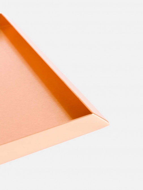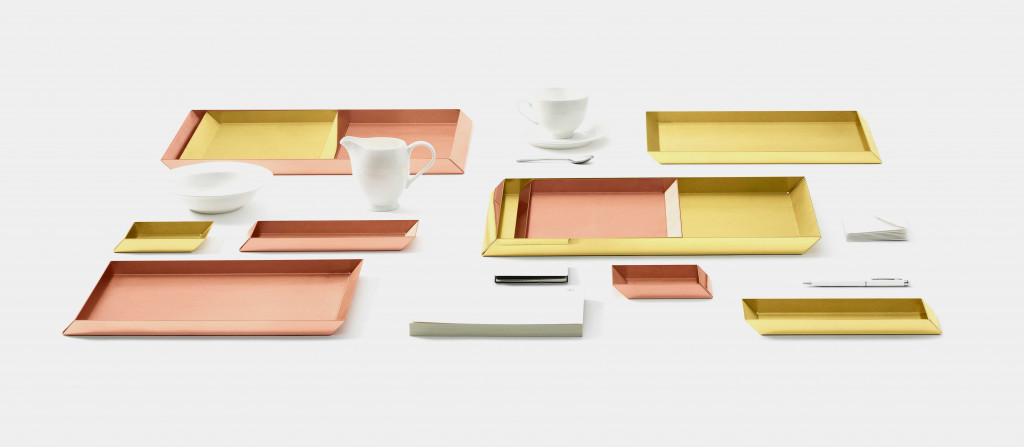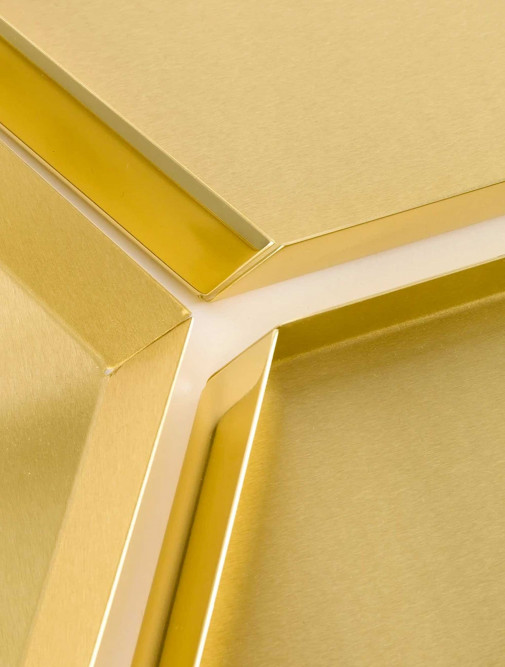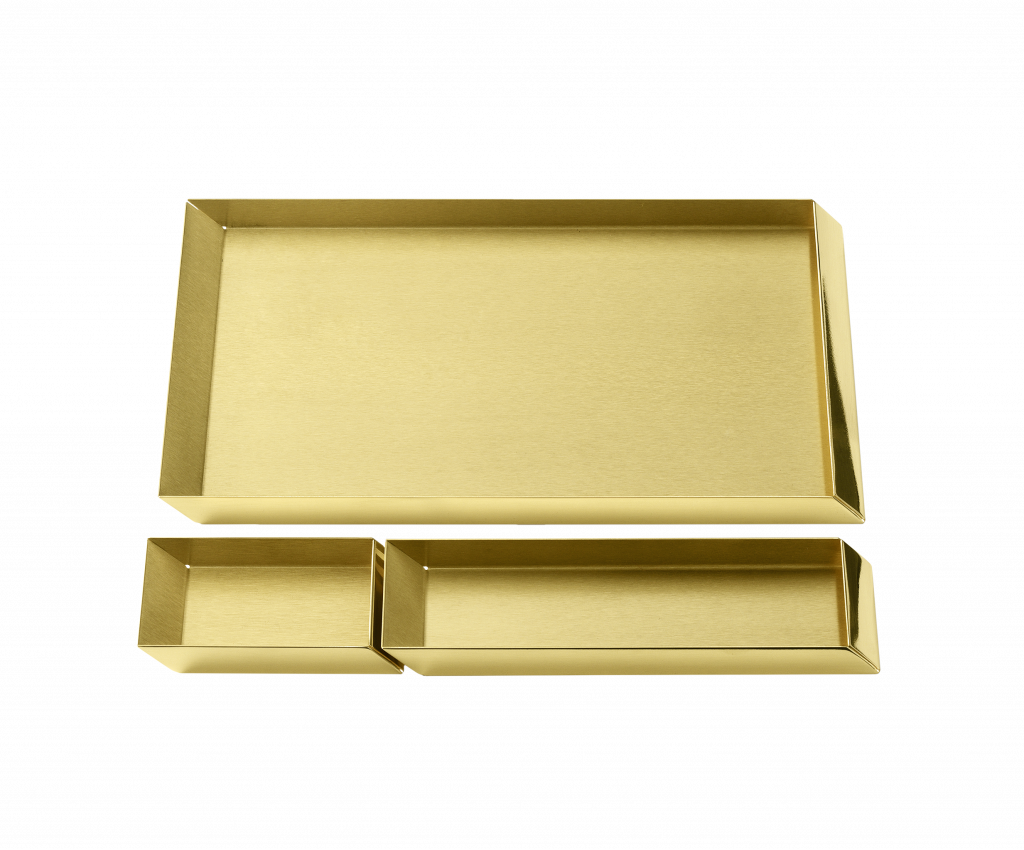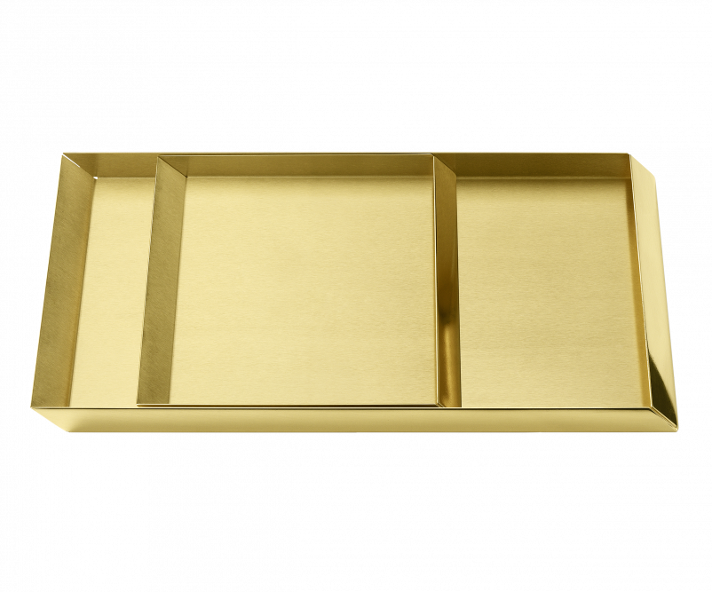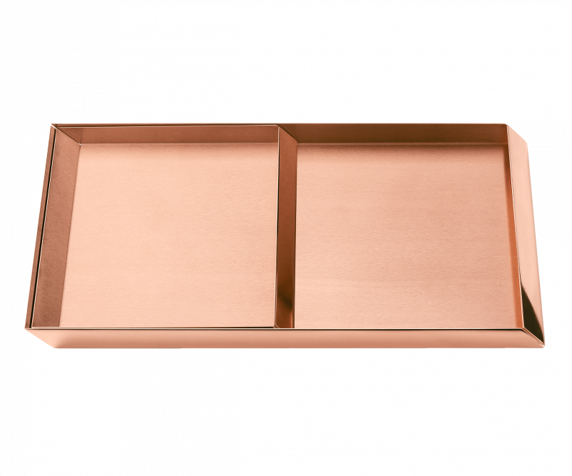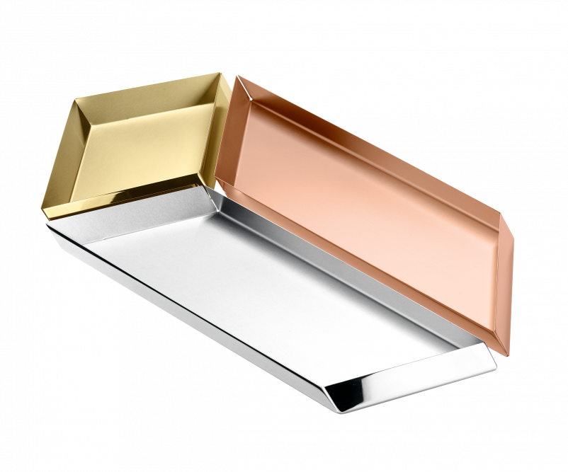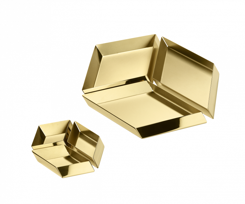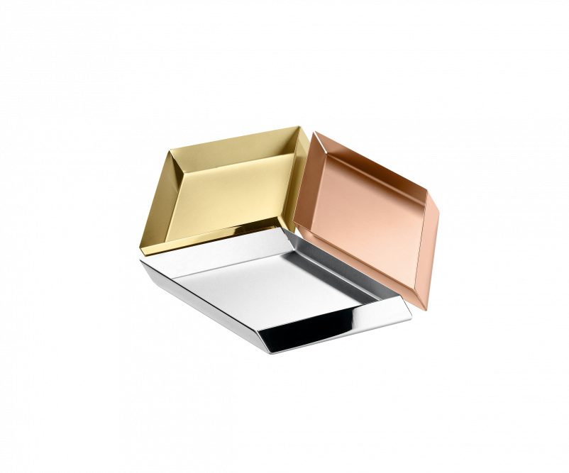 The compositional scheme of this family of small trays is the axonometric isometric projection of two parallelepipeds which creates a three-dimensional optical effect implemented by inclined edges and by contrasting metal finishes. Like in a game, you can get as many configurations as you wish, always creating different designs.