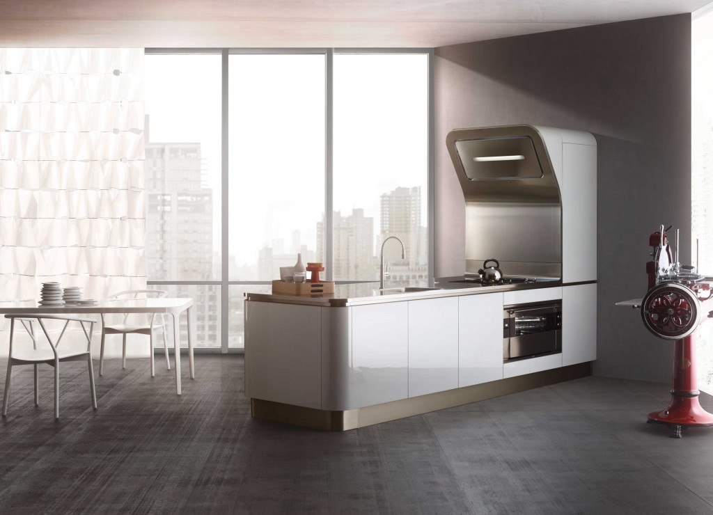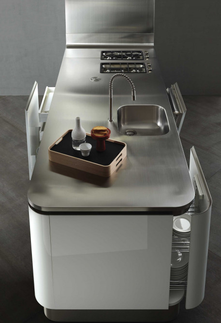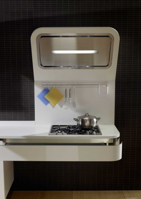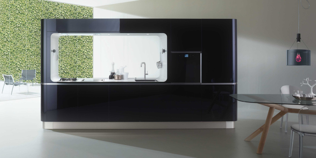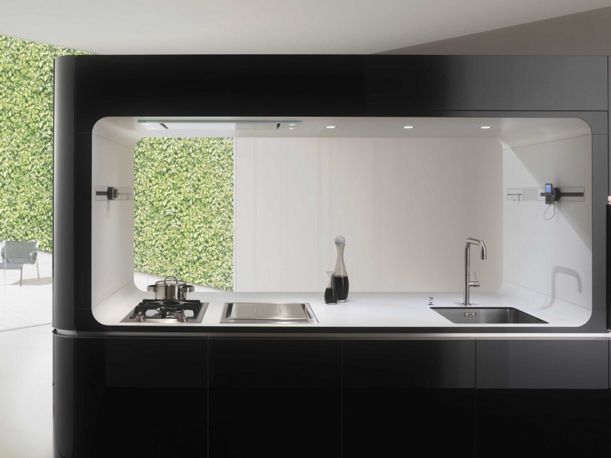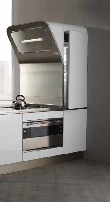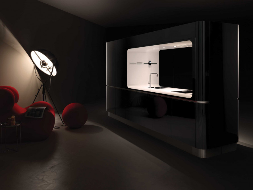 The kitchen as central hub of the environment. Self-carrying, technological and functional object around which one may share a view of the space in which new domestic rituals will take place. An icon which reinvents living spaces.