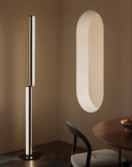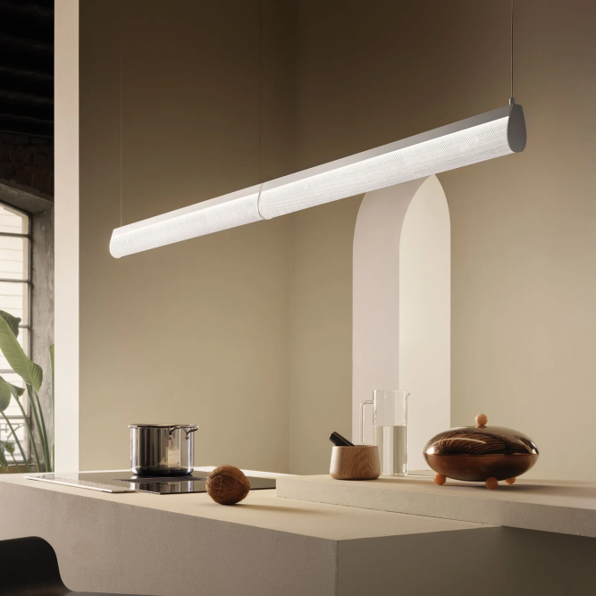 Modula is a versatile collection that creates unexpected plays of light. Columns from Medieval cloisters inspired a Plissé effect, and sparkling stones are reflected in a Crystal effect, each taking a lamp that is outwardly minimal to an explosion of creativity, where even, linear light liquifies throughout.
