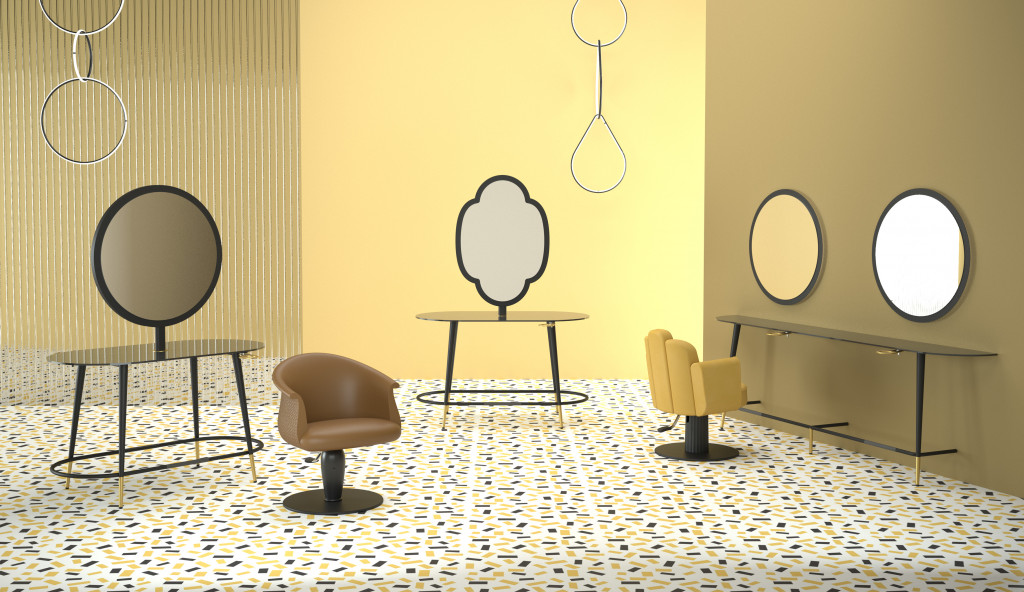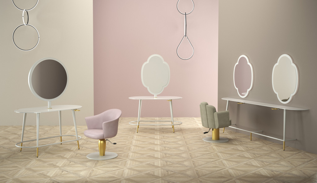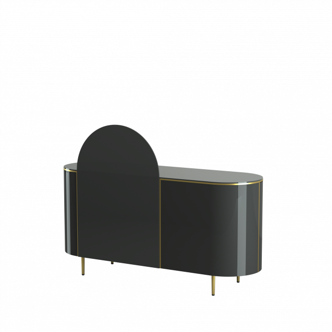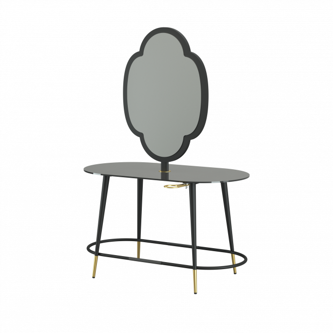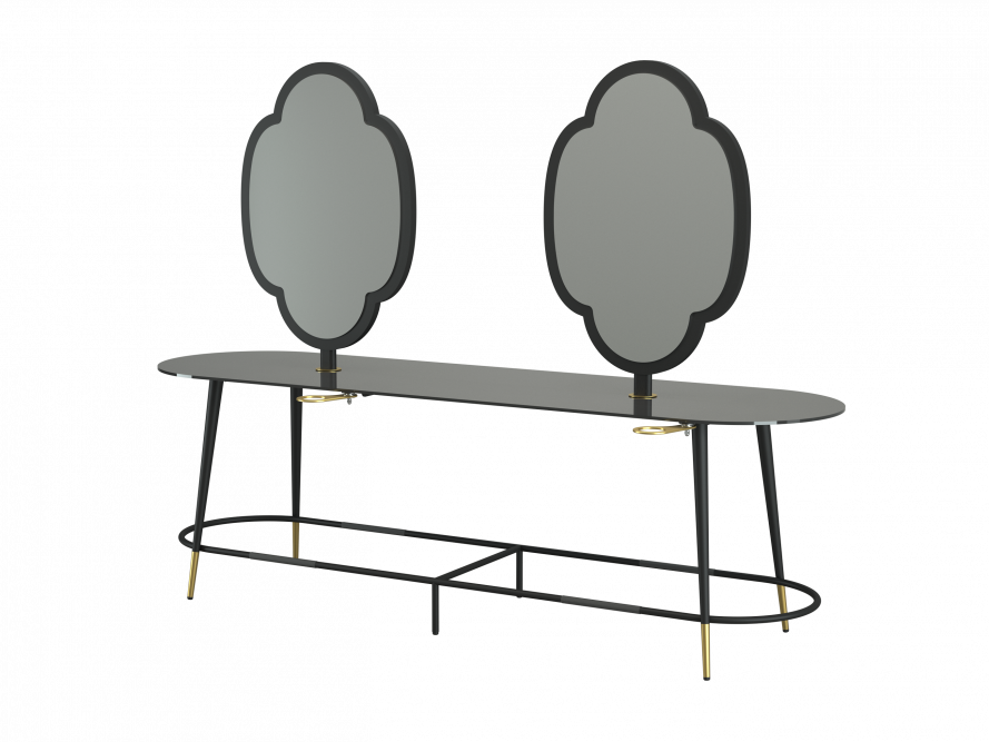 Inspired by the Modern design of the 1950s, it has a vintage soul but a contemporary look, and with its slender lines it fits in perfectly with new furnishing trends. The structure is made of stove-enamelled metal, the top is made of paste coloured glass, and the metal-framed mirrors have two different shapes, four-petalled Fiore and Circle Sole.